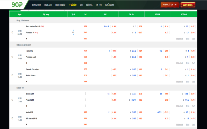 90P cập nhật tỷ lệ kèo chuẩn xác và toàn diện