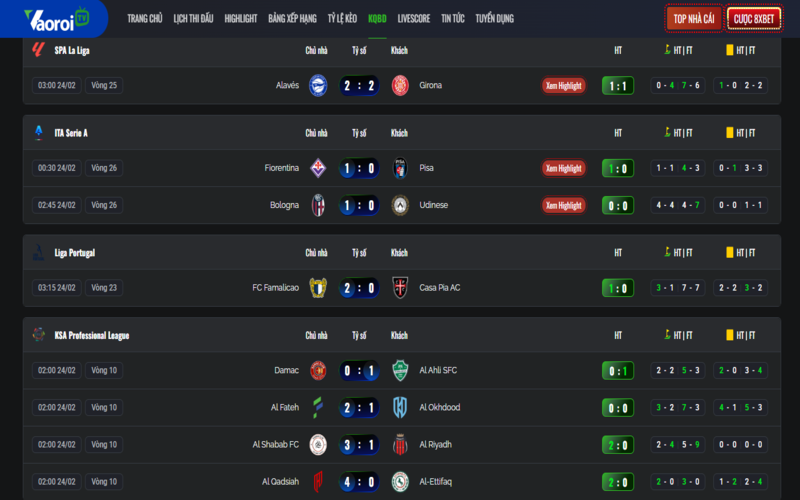 Hệ thống liên tục cập nhật lịch thi đấu và thứ hạng các đội bóng ở nhiều giải đấu, từ cấp câu lạc bộ đến đội tuyển quốc gia. Nhờ đó, người hâm mộ luôn chủ động sắp xếp thời gian và theo sát cục diện mùa giải.